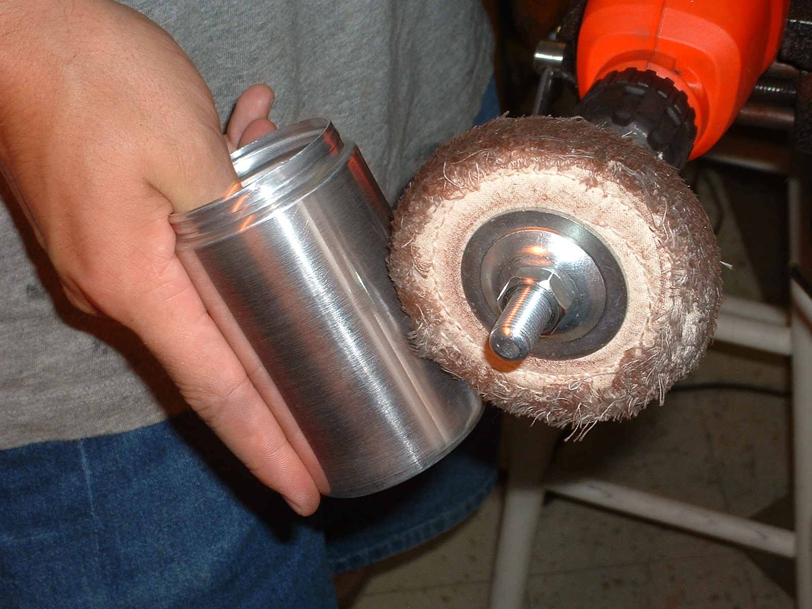 I begin by polishing the shakers thoroughly, first with white buffing compound and then with jeweler's rouge. The goal here is to remove as much of the pieces' existing oxide layer as possible (so that it can be anodized) and to achieve a shiny finish (so the final product will look good). My "bench polisher" here made of an arbor jerry-rigged to a variable-speed drill, which is in turn held in a vise.