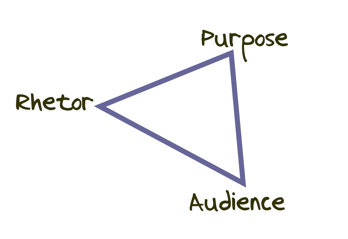 The rhetorical triangle is a way of thinking about what's involved in any communication/persuasion scenario. It involves (no surprise here) three main parts:
