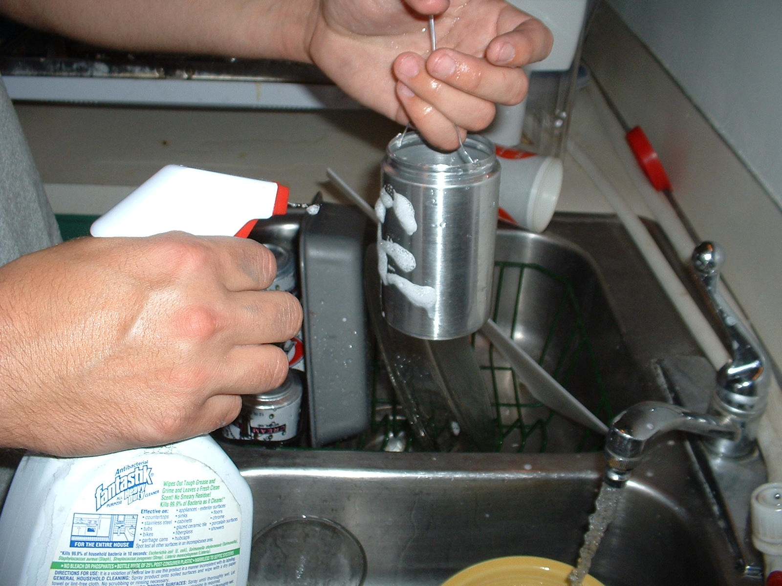 I clean the shakers thoroughly with detergent and water to get off all the oils and any remaining buffing compound. They are now ready for the anodizing tank. (It's also possible dunk the pieces in a lye solution to completely remove all traces of the existing oxide layer, but this also dulls the finish.)