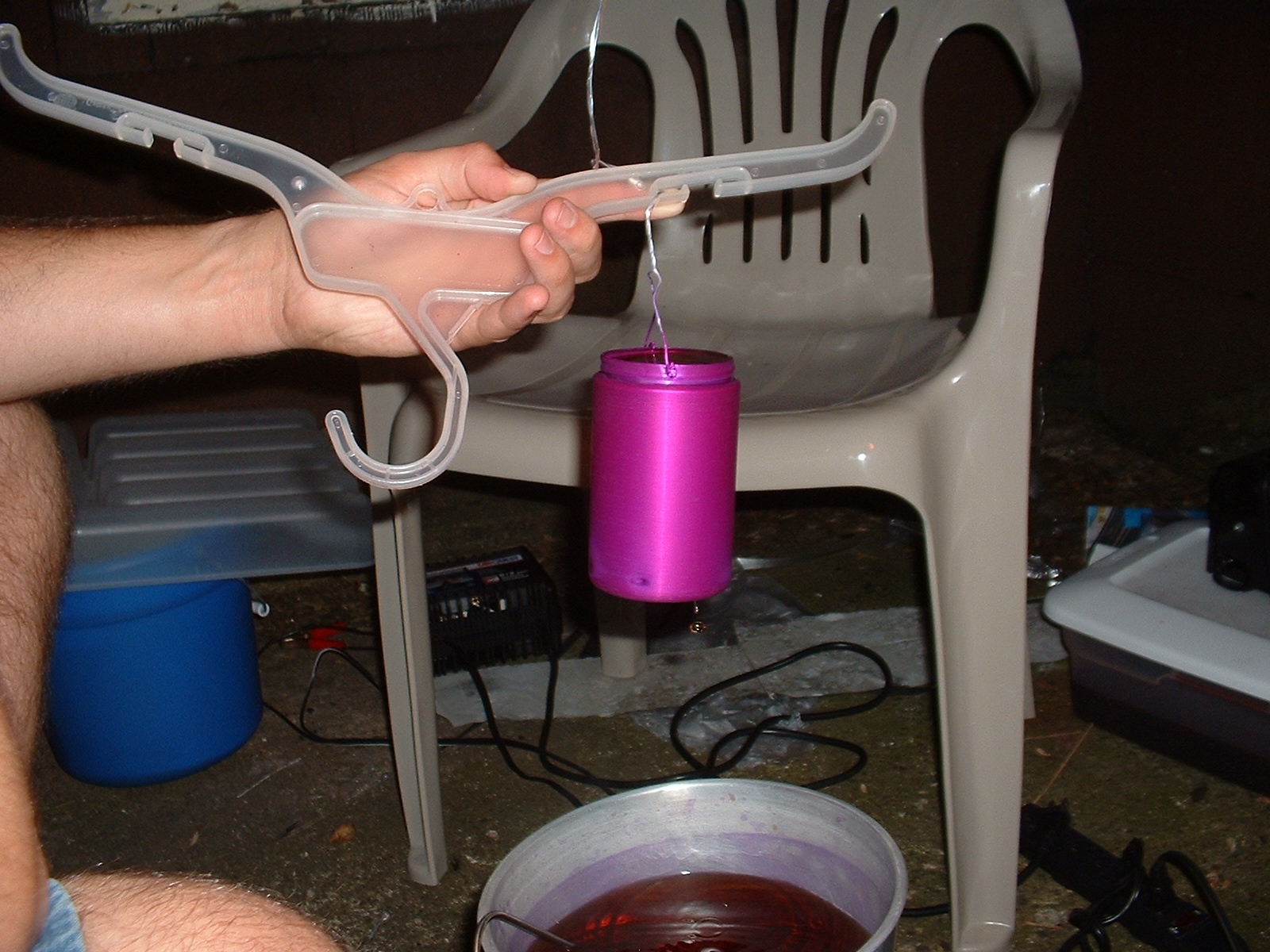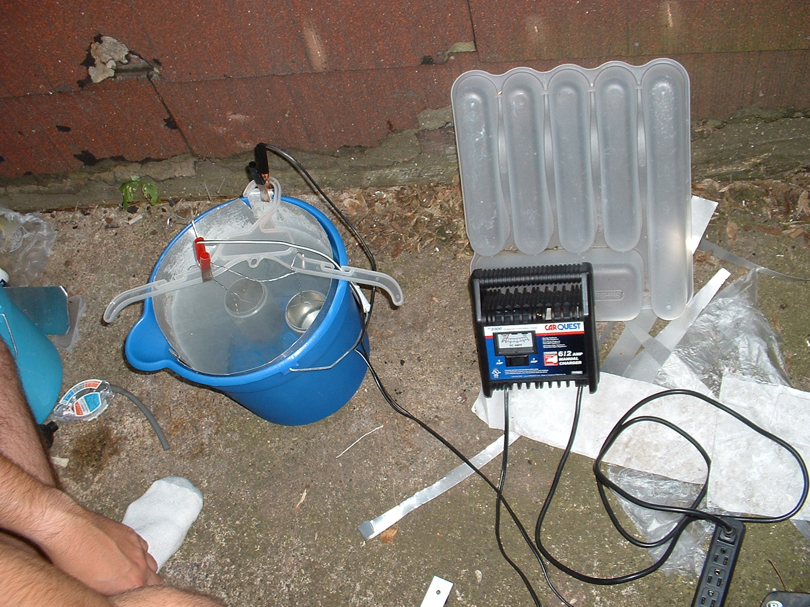 The battery charger hooks up to the the bucket lining (the cathode, which is negative) and the shakers (the anode, which is positive). After turning on the current, bubbles form in the solution. The piece to be anodized will stay in until between 4 and 12 amp-hours of charge have flowed per square foot of surface area. As the oxide layer forms, the current will change, making it necessary to estimate the total amp-hours by taking readings every 10 minutes or so.