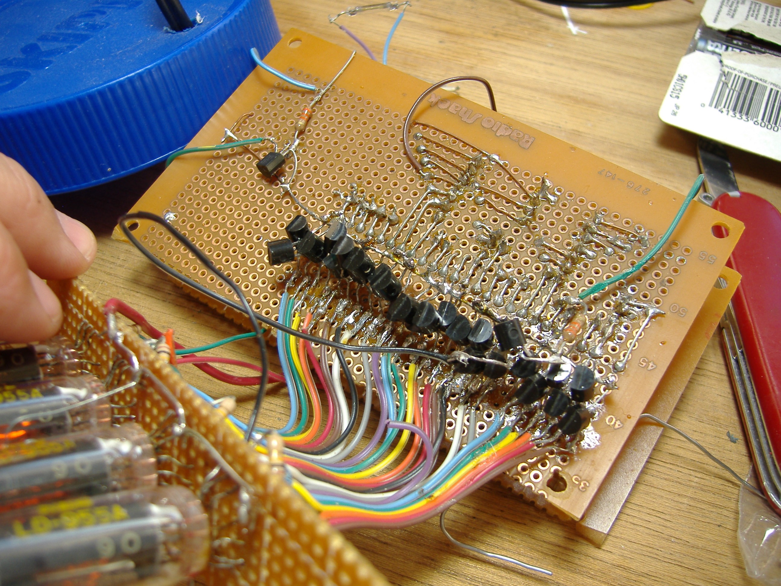 Because the driver ICs for these tubes are hard to get, discrete transistors are required to switch on and off the elements of the display—one for each tube digit and one for the flashing seconds lamp (28 all told).