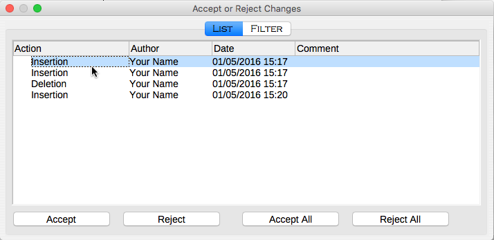 - From the "Edit" menu, select "Changes" and then "Accept or reject..." A window like the following will appear, allowing you to navigate to any of the changes recorded in the document just by clicking on them: